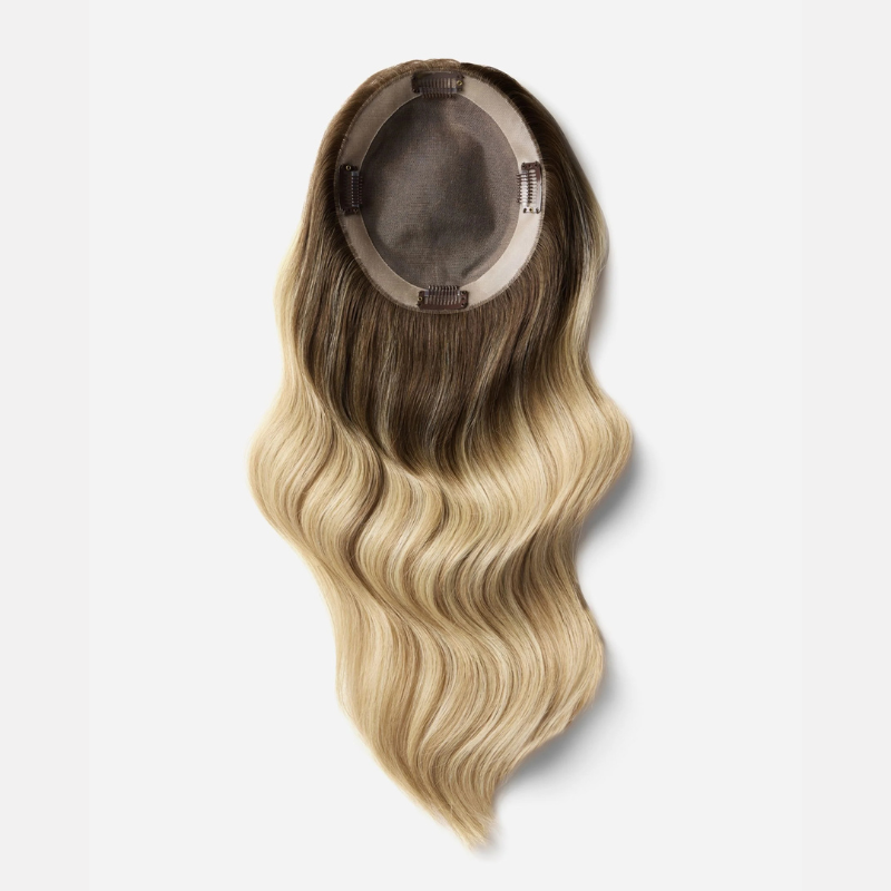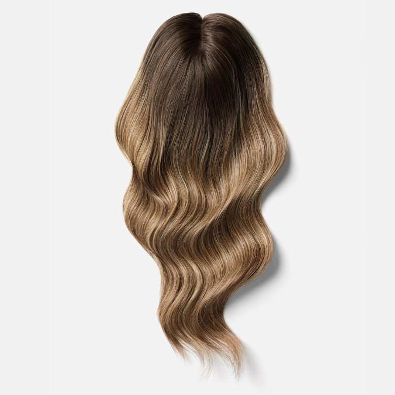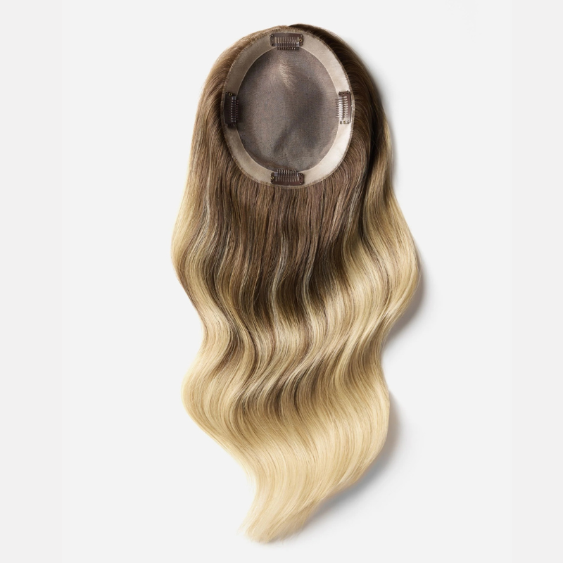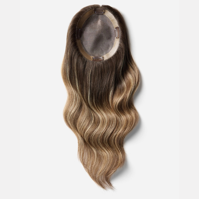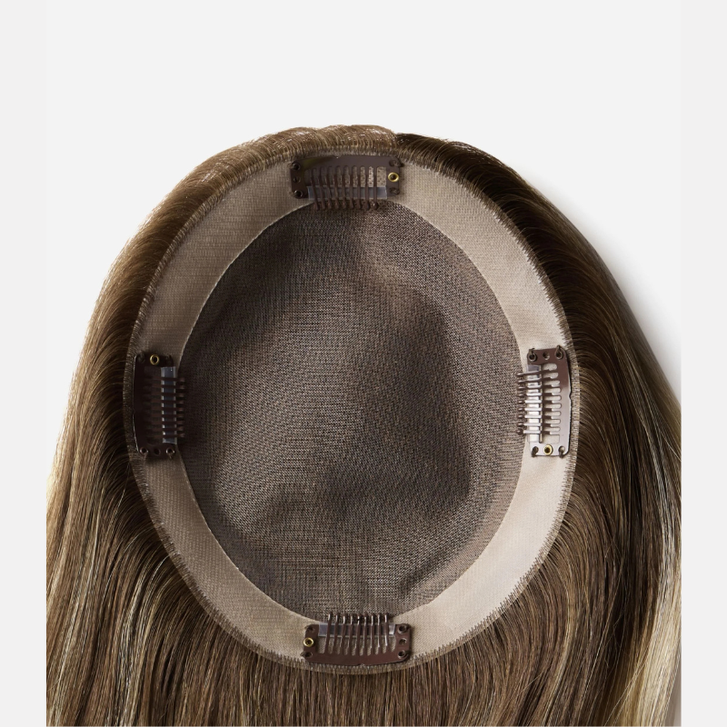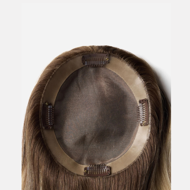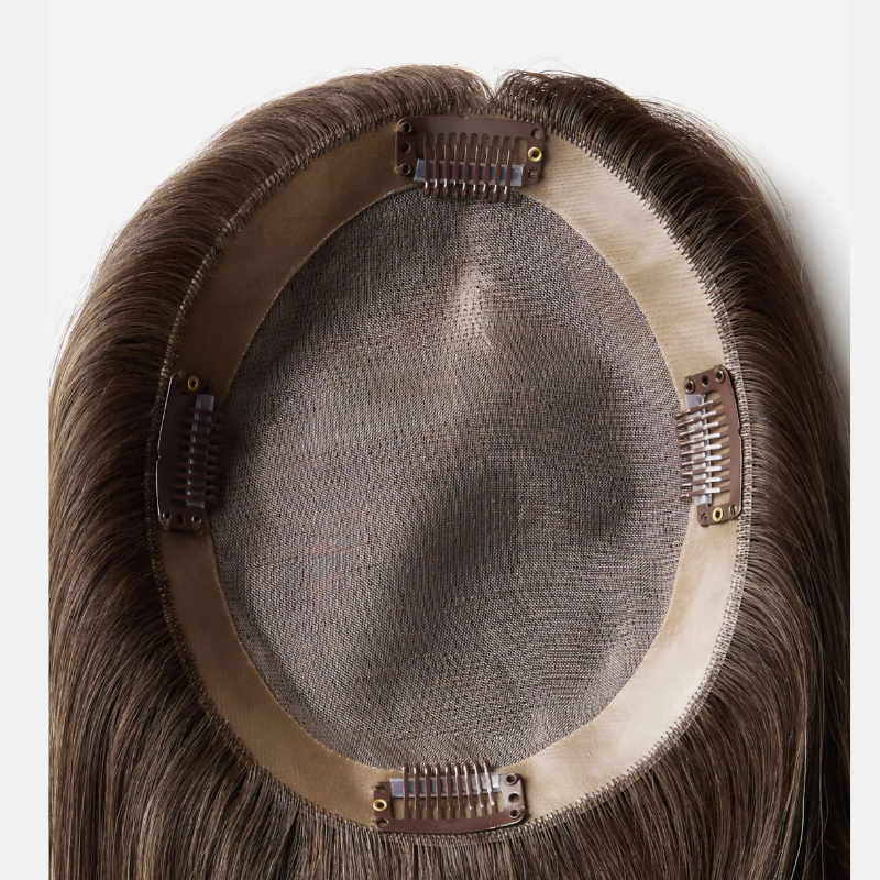 A free part hand-tied human hair topper, high quality Brazilian virgin hair, silky healthy hair texture. The hair can be styled and dyed like your own hair.